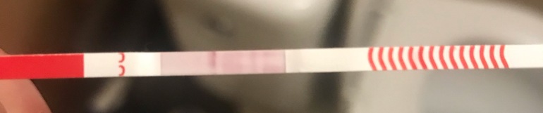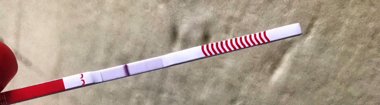 Хм.. легла в 1.30, в 4 захотела в туалет, думаю надо сделать наверное тест, показал одну полоску. Потом проснулась в 8 и замочила и вот что получилось, сначала он покраснел но сразу видно было очень хорошо вторую полоску, потом высох и стал обычного цвета и со слабой второй полоской,ее видно больше чем вчерашнюю утреннюю. Целую ночь болит поясница справа и живот там же