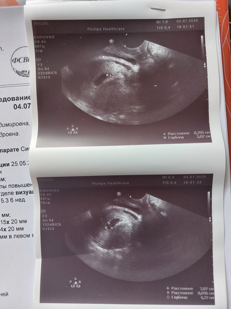 Итог: отслоек и гематом нет. Есть плодное яйцо вытянутой формы, СВД 15 мм + желточный мешок 3 мм. Эмбрион врач не разглядела. Сказала, "перекрывается желточным мешочком", а в заключении написала "чётко не визуализируется".
