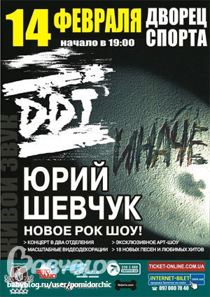 КонцертыСходили на концерт!!!.......Честно говоря не ожидали таких координальных изменений в творчестве и в группе))) но все-равно понравилось ОЧЕНЬ!!!!!!! Мегахаризматичный человек - Юрий Шевчук, прям заряжает позитивом и энергией!!!! Наверно тур уже прошел и в России и в Украине, но если еще куда он собирается ехать, то идите, не пожалеете!!! Новый альбом можно сказать "интересный", где-то непонятный, но вцелом Очень хорошо!!! Жаль что из старого мало было спето((( Всего не успеть.....