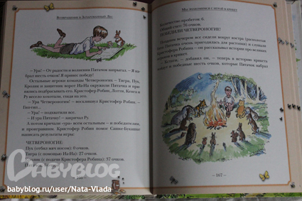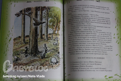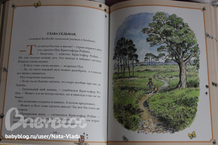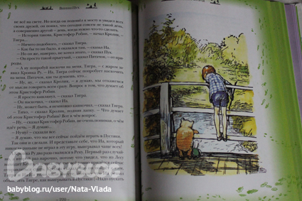 В издание вошли две книги Милна: «Вини-Пух» и «Дом на пуховой опушке». В каждой части по 10 глав и еще есть Приложения с песенками Винни-Пуха. Несмотря на непростую манеру, в которой написана книга, Владе очень нравится. По одной главе на ночь – и за месяц мы ее «проглотили»)) И что мне особенно приятно – выводы о том, что хорошо, а что плохо, не преподносятся ребенку на блюдечке с голубой каемочкой – тут надо сначала хоть чуть-чуть подумать.