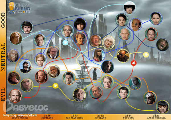 Шла на него в ожидании, что мозг закипит, т.к. о нем говорили, что это три часа умственной работы. Не вскипел, хотя интересны все шесть сюжетов и они удачно накладываются друг на друга, без путаницы. Это для тех, кто любит имена героев на листик выписывать при чтении.