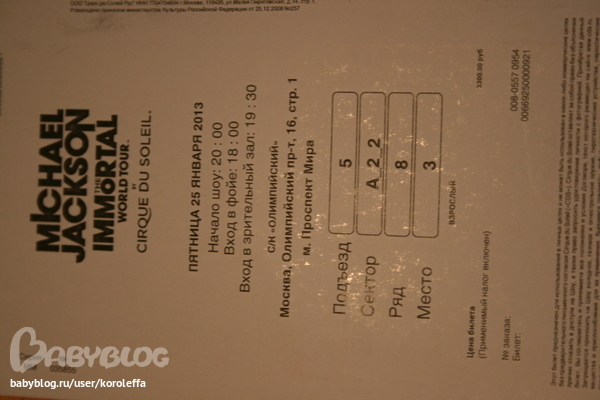 шоу Michael Jackson THE IMMORTAL World Tour. Шоу состоится 25 января в 20 часов в СК "Олимпийский" .Стоимость билета 3300.Отдаю за 2000!!!