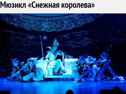 Мюзикл очень понравился - отличные костюмы, игра света и музыки. В спектакле задействовано много детей - хорошие голоса героев, трогательно танцуют светящиеся снежинки.