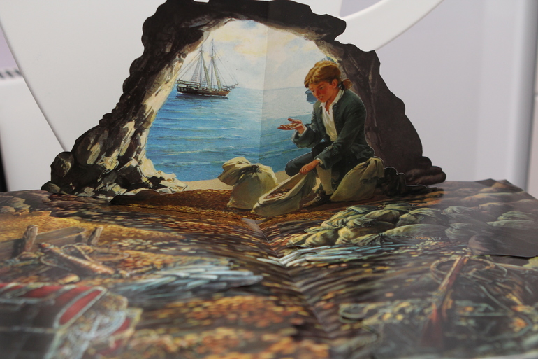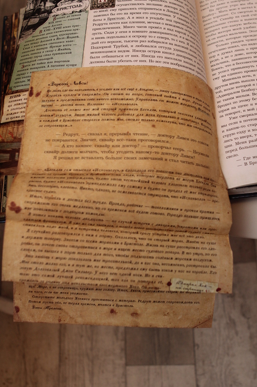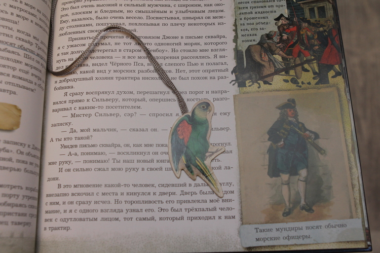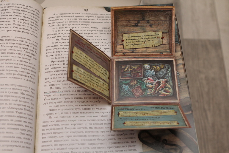 На внутренней стороны обложки - конверт с картой сокровищ, инструкция мастер-класс о завязывании морских узлов и большая карта- схема строения корабля.