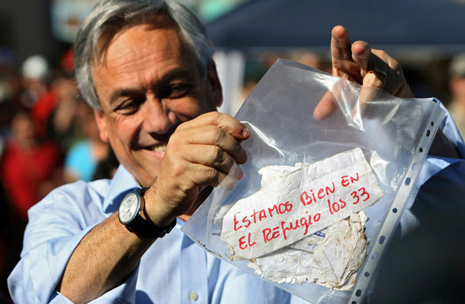 А это президент Чили, держит записку , написанную горняками , что они там живы и ждут помощи , поднятую через 8 см отверстие с 700 метровой глубинны