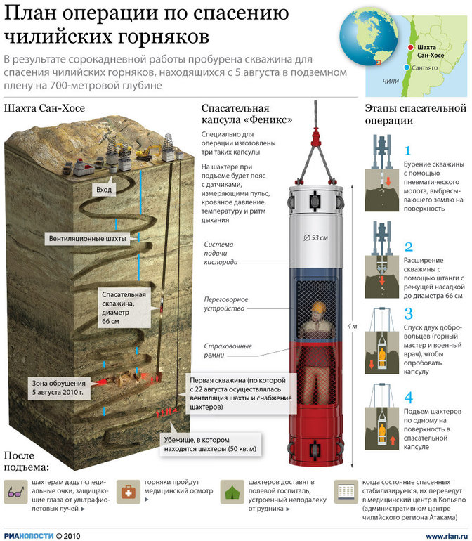 В 2010 году 33 чилийских шахтера оказались под завалом и находились там более 60 дней, они не знали смогут ли их спасти, их семьям дали 1 процент надежды из 100 и впервые провели сложнейшие операции по их спасению, посмотрите это кино, оно того стоит. А вот фото тех времён!