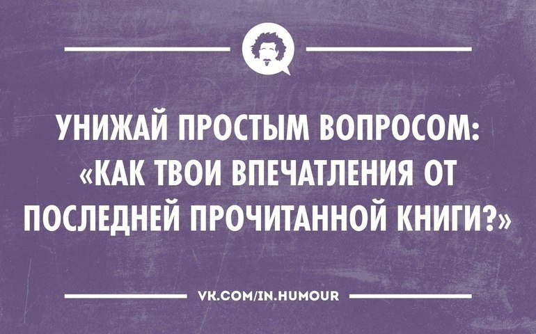 мы когда с друзьями встречаемся, практически всегда обсуждаем новинки кто-что прочитал, какое кино посмотрел, на каком спектакле были...мне кажется это норма)) Часто мнения не совпадают кому-то салют и вспышки разума,а кому-то так себе ))))) Так что меня таким вопросом не унизить)))))))))) Кстати последняя книга прочитанная пару дней назад, не впечатлила: Гришковец, "Боль", ходит по кругу уже не первую книгу )))))