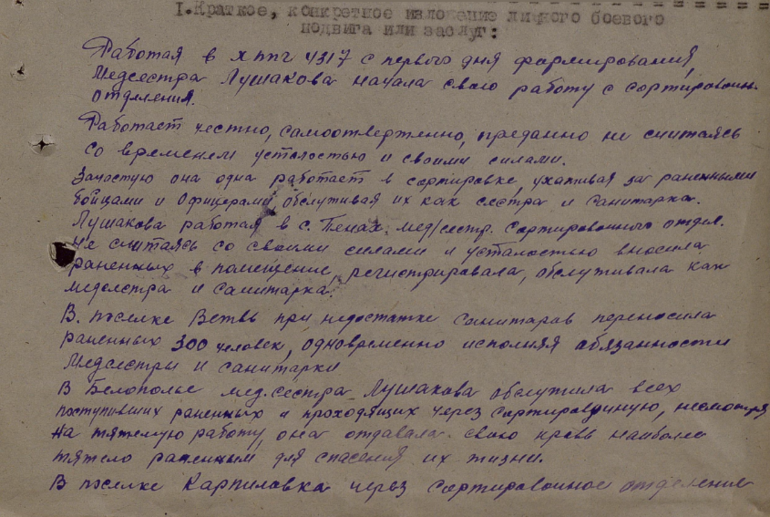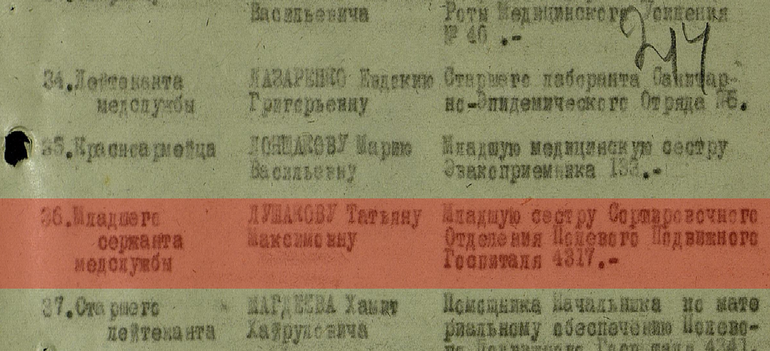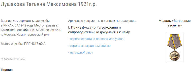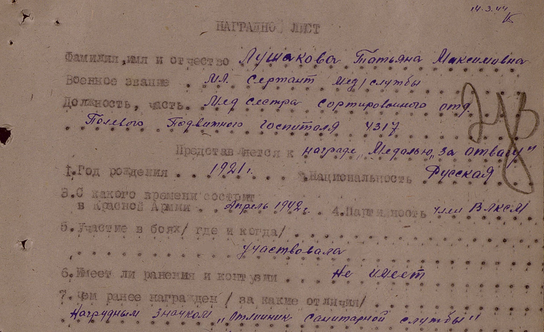 Совсем молодая девушка попала на фронт медсестрой. Рассказывала, как две недели их перевозили в первый госпиталь в грузовом вагоне. Как покрылись блохами, как выгрузили их на поляну, которая была вся покрыта земляникой, тут же сожгли всю одежду, от блох треск стоял невиданный. Бабушка рассказывала, что поляна была чудная, пели птицы, земляники было и цветов видимо-невидимо, и было тихо- тихо, они пошли в баню, а выйдя из нее, вся поляна была уложена тысячью раненными солдатами. У кого не было ног, у кого-то пробита голова, стон стоял жуткий. Их три сестры и один врач. Тут же началась бомбежка, и эти все солдатики, кто хоть как мог шевелиться, поползли в лес в укрытие. Нацисты бомбили красный крест не смотря на международные договоренности. Вот такой был первый день студентки Тани. Бабушка прошла всю войну до Германии. Была почетным донором, получила медаль за боевые заслуги. На себе перенесла 300 солдат за один раз, даже есть документы говорящие об этом. На войне встретила дедушку. И до конца своих дней общалась с фронтовыми подругами. Конец войны она вспоминала, как дремала на стуле рядом с ранеными уже в Германии, как за окном началась стрельба и она очень испугалась, что немцы так близко, выглянув в окно увидела, что это свои пуляют в небо, узнав что случилось, солдаты закричали: Танечка! Война закончилась!!!!