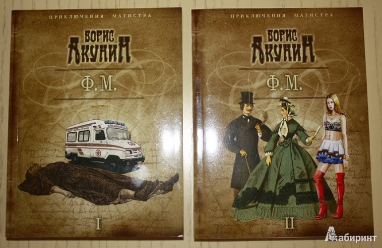 Так вот, все книги этой серии развиваются в двух временнЫх плоскостях: в современном Николасу Фандорину мире и в прошлом. Три книги, кроме этой, раскрывают нам историю фон Дорнов, то есть рассказывают о предках вышеозначенного сэра, "Ф.М." же представляет собой книгу в книге: книжный персонаж ищет, находит и читает книгу (что характерно, тоже вымышленную). Сложно сказать, что интереснее: приключения магистра или альтернативная версия всем известной классики.