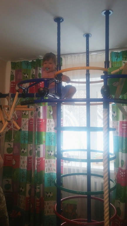 Доча ползает, встаёт и ходит вдоль опоры. Мечтает прыгать и делает попытки. Очень нравится ей смотреть, как братишка на батуте прыгает.