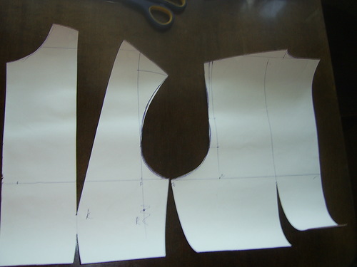 поскольку под грудью у нас планируется подрез, отрезаем низ до нужной длины. Для создания сборочек на лифе выкройку полочки нужно изменить. Делаем это так: разрезаем выкройку в трех местах почти до конца, разводим на несколько сантиметров и фиксируем при помощи скотча(или обводим новую выкройку), скругляем низ.