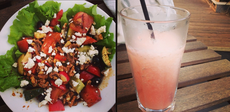 Салат из овощей с сыром фета и грецкими орешками и клубничный смузи.