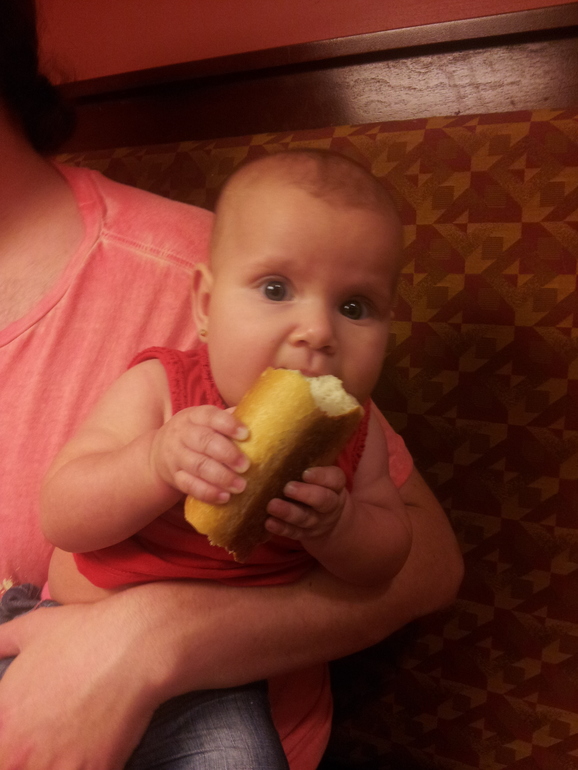 Ух ты, у вас уже ушки проколоты... А я не решусь всё никак че-то :(И по теме — это она хлебушек грызет?