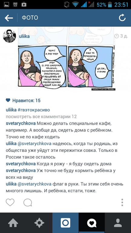 Из хорошего: когда были в гостях у дедушки мужа, его жена вдохновилась тем, как мы едим без стеснения при всех (тихонечко в слинге), сказала, что теперь знает, какой картины в доме ей не хватает, и решила у знакомой художницы заказать картину кормящей мамы с младенцем. Мне это было приятно :))