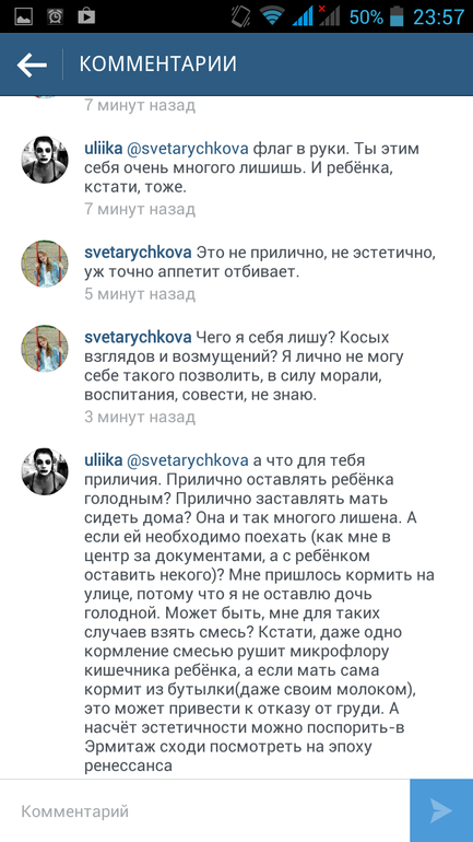 Я вот тоже не понимаю, почему гамбургеры жрать на улице прилично, а грудью кормить не прилично! Декольте до пупка это нормально, а кормление грудью, которой даже не видно это не нормально. Что мы можем поделать, если Бог так задумал что младенец питается молоком из груди матери. Я кормила везде: на кассе супермаркета, на лавочке на улице, в ТЦ, в кафе, что удивительно ни разу мне замечания не сделали.