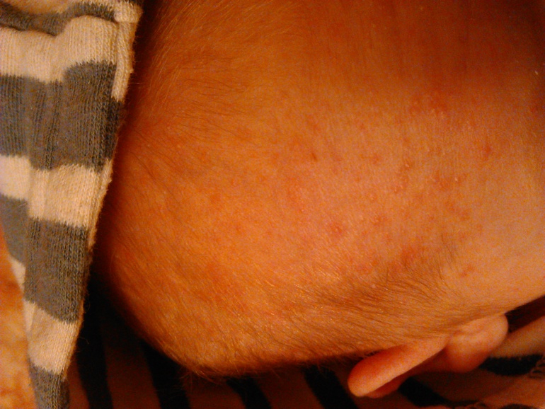 Неделю уже. Началась с щек. Пошла по голове, даже на ушах немного есть. Сегодня я заметила что есть и на груди уже. При этом на щеках почти пропала. Мазала на щеках фенистил гелем. Было предположение что на сгущенку, уже неделю ее не употребляю, но результата нет.