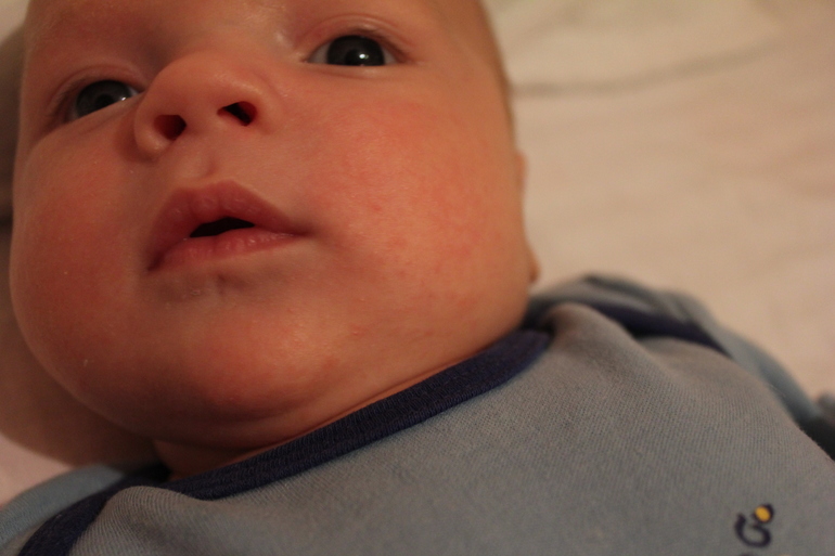 Ну а вот так мы выглядим - сыпь в основном щеки и подбородок, (фото чуть отсвечивает - она ярче) немного на лбу и груди, больше нигде. И еще когда сын кушает и мое молоко попадает на щечки ему - они становятся прямо сильно красными, через время проходит.