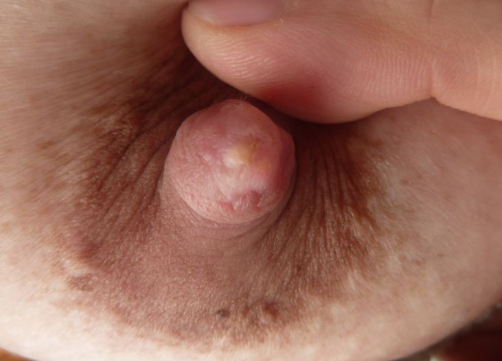 Жжет весь сосок, особенно после кормления. Доча сильно уж иногда впивается. Такая картина на двух грудях. Я уже рот у ребенка посмотрела - чисто там.