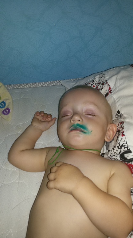 Я решила пойти дальше. Намазала зелёнкой, наклеила пластырь. Говорю: титя боба. Он похныкал, но есть не стал. Через пару часов, когда не получилась уснуть от книжек, мультиков, и даже прогулки, он снова попросил грудь.