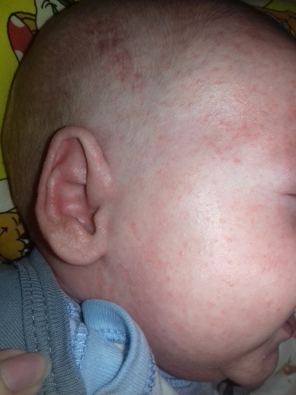 Прыщики краснее становятся когда плачет, проснулся, после ванной и жарко( отлежпл)... А так бледненькие? Это скорее акне. Проходит само, проявляется сильнее к трем неделям, проходит к трем месяцам