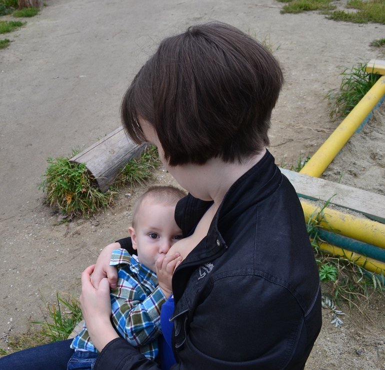 Здесь ребенку где-то 1,3. Кормление в укромных местечках случались, но не слишком часто. Те, кто считает, что кормящие по требованию, это люди, которые вываливают грудь даже переходя по пешеходному переходу - Вы серьезно?))) Всегда можно прикрыться - и когда ребенку месяц, и когда ребенку полтора года.
