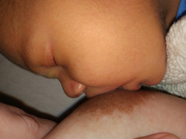 На ней видно, что первое, что касается груди, это нижняя губа. Касается она в районе края ареолы и там и остается, потом ребенка за лопаточки двигают в сторону груди и он захватывает ареолу, сосок попадает в рот в последнюю очередь.