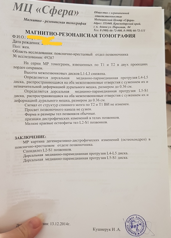 4 года назад слегла со спиной, сделала мрт, оказалось остеохондроз пояснично-крестцовом отделе позвоночника. В течении 2 недель лечилась, по 3 разных укола в день, таблетки и мази.