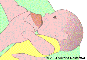 Поддерживаем ребенка так, чтоб основание его головки и плечики опирались на мамину ладонь. Рука мамы не должна давить на затылок. Важно дать хорошую опору телу ребенка, чтобы ему было удобно сосать, плотно прижимать его к себе, животик к своему животу. Если нужно дать грудь «прицельно», удобно делать это в положениях «из подмышки» или перекрестной колыбельки. В этом положении рука мамы как бы формирует «вторую шею» для ребенка, ладонь поддерживает область шеи и между лопатками, большой палец расположен под верхним ушком, указательный и остальные — под нижним.