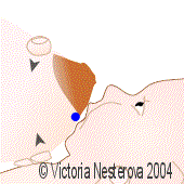 Исходное положение: ребенок расположен очень близко к груди, сосок направлен к его носику. Если направить сосок прямо в рот, есть риск, что челюсти ребенка сомкнутся слишком близко к соску, маме может быть больно. Грудь мы уже сформировали для удобного захвата. Готовый поесть ребенок сам вертит головкой из стороны в сторону, раскрывает рот и опускает язычок на нижнюю десенку. Если рот раскрывать не рвется, можно провести по его губкам нижней частью ареолы. Почему не соском? Если ребенок без проблем берет грудь, в общем-то все равно, чем и как проводить, но если он склонен втягивать в полузакрытый ротик все, что касается губок, можно не успеть — шустрый малыш мгновенно засосет кончик соска, что может быть весьма неприятно. В стартовом положении нижняя губка малыша уже расположена там, где она будет во время кормления — обратите внимание на синюю точку.