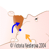 - Чуть наклоните голову вперед. Попробуйте широко открыть рот. Неудобно, правда? Заметьте положение языка — он приподнялся и находится далеко за деснами. А для сосания груди необходимо, чтоб язычок был над нижней десной, прикрывая ее сверху и охватывая грудь.