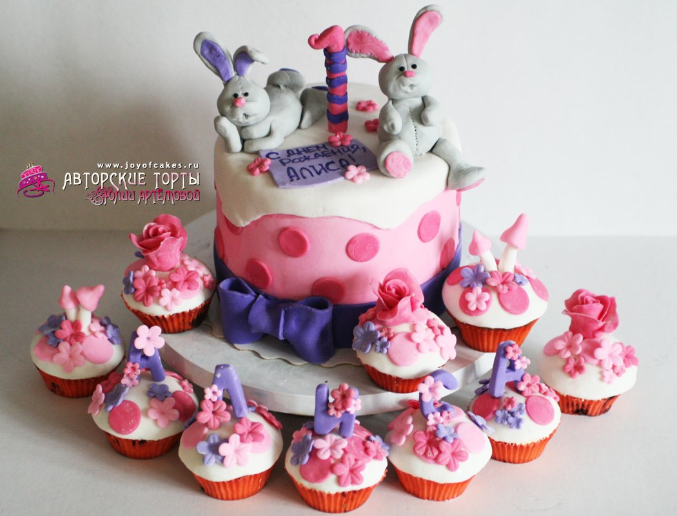 и заканчивая подготовкой конкурсов и плакатов! Итак: у нас торт, капкейки, колпачки, плакаты, анкеты, обертки для шоколадок были сделаны индивидуально под наше платье!! Было множество идей, но на часть из них просто элементрено не хватило времени! Из подготовленного: Я заказывала видеофильм о первом годе жизни Алисы из наших семейных фотографий и видиосюжетов; заказывала несколько плакатов об имениннице, колпачки под ее платье, куклу тильду-зайца в таком же платье как и у именинницы, анкеты на знание Алисы с местом для пожеланий для нее! Заказывала обертки в стиле шоколада Аленки, только с изображением дочки и с ее именем! Гостям мы помимо шоколадок дарили еще и бомбоньерки с зайцами!! Тема зайцев у нас так сказать проходила через весь праздник, так как дочка у нас в год зайца родилась, а также у нас все было в горошек, так как платье у нас праздничное было в горох!! Отмечали мы праздник в 2 захода! Первое празднование состоялось день в день для наших маленьких друзей в детском развлекательном центре! Всего было около 10 деток вместе с Алисой! Был стол, аниматоры, конкурсы, танцы! Второй день празднования состоялся в выходной день, куда были приглашены уж взрослые родственники- бабушки и дедушка, а также крестные! Вообщем празднование удалось! Дочка осталась довольна6 а мы любуемся на фотографии красивые(кстати мы приглашали фотографа) и вспоминаем про наш праздник!