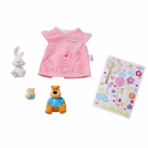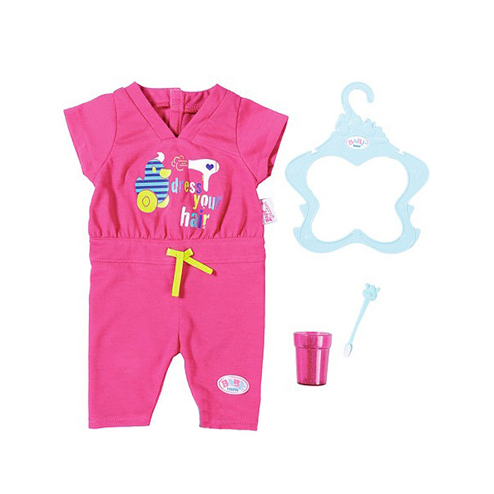 Этот комплект одежды для Baby Born представленный торговой маркой Zapf Creation, подойдет для куклы, размером не более сорока трех сантиметров. В него входят: футболка, лосины, розовая юбка-пачка и солнцезащитные очки.