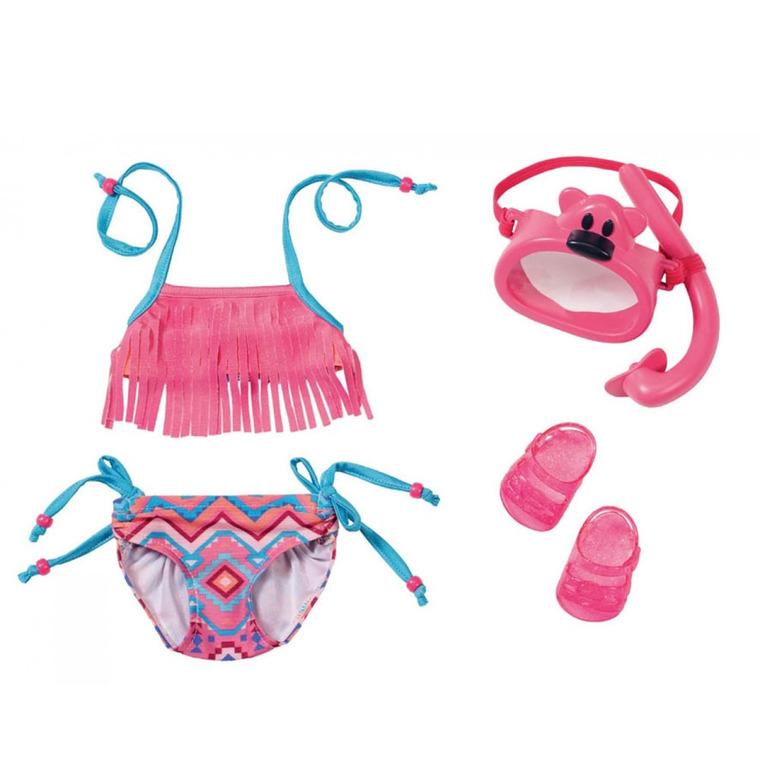 Набор одежды для кукол серии Baby Born "Купальник с аксессуарами" включает в себя раздельный купальник мягкие туфельки и маску для купания с кислородной трубочкой. Купальник сшит из прочной ткани, а маска и туфельки изготовлены из прочного пластика. Купальник надевается легко и завязывается на веревочки. купальник и аксессуары выполнены в одной цветовой гамме.