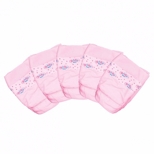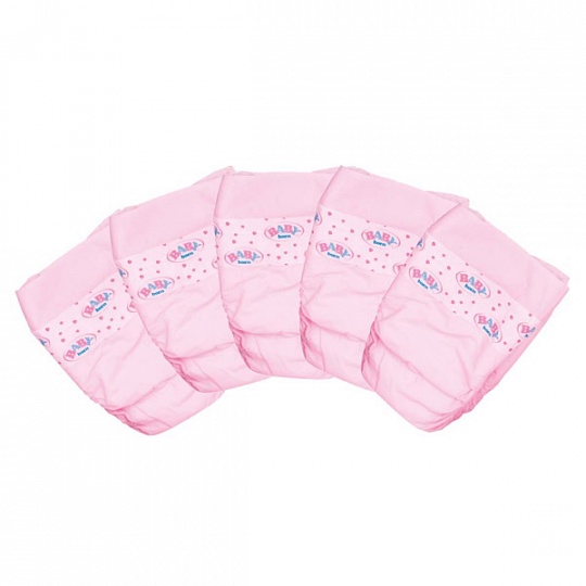 Набор подгузников для кукол от Zapf Creation Baby Born прекрасно подойдет для реалистичной игрыКуклы Baby Born после питья или приема специальной кашки могут писать как живые младенцы, поэтому им так же необходимы подгузники. В комплекте можно найти пять розовых подгузников, которые изготовлены тем же способом, что и детские памперсы.