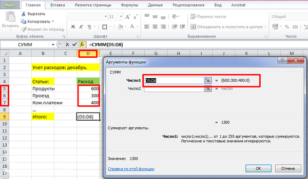 ДЛя расчета суммы нужно задать данные из каких ячеек следует просуммировать (Столбец D - строки с 5 по 7).