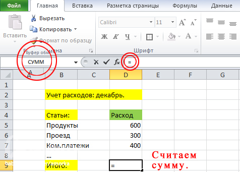 5. Чтобы посчитать ИТОГО в строке формулы пишем "=" и слева выбираем нужную формулу - практически всегда нужна сумма - СУММ - она автоматически там появится, так как самая популярная.