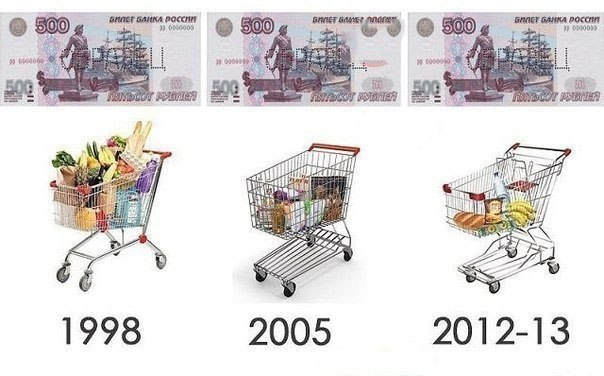 мы с мужем 2 года назад тащили из магаза 4 больших пакета на тыщу рэ.. сейчас еле 1 набирается)))