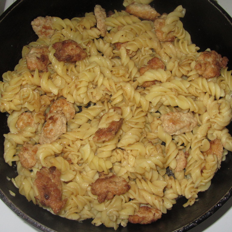Отварила макароны. Вода в мини котлетках почти выкипела. Смешала все вместе. ну вот ужин готов)