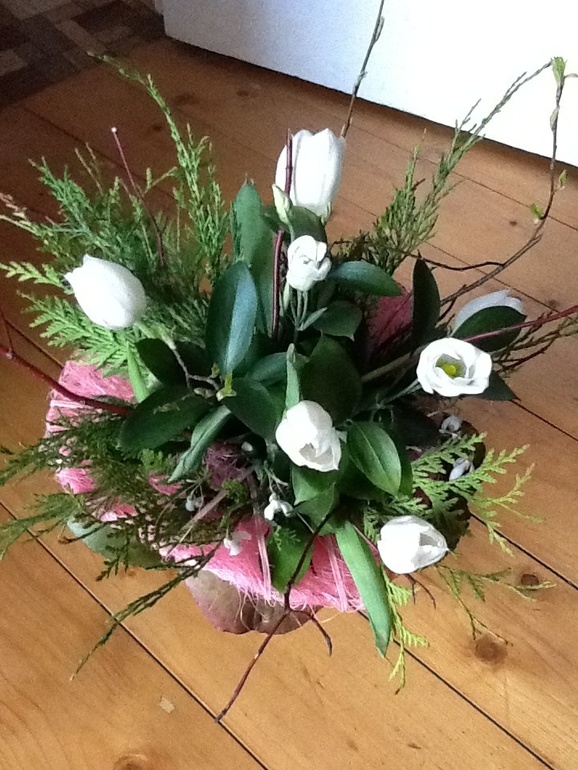Тюльпанов 5, а 2 цветочка (не знаю как называются) это я отщипнула из букета, который мне муж подарил на рождение дочки. В него мы тоже веток напихали, но не так красиво получилось, поэтому не выкладываю.