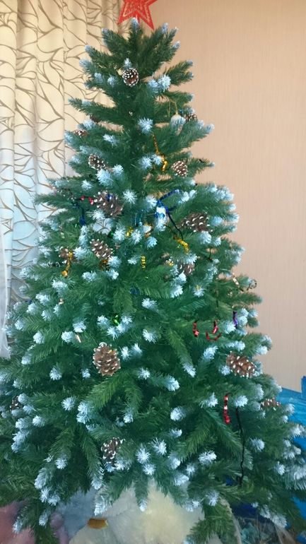 мы купили в икее, за 3 т.р. 1 м.80 см, но она не пышная, а как настоящая елка, лысая)) но мне нравится и то, что иголки резина, а не бумага резаная
