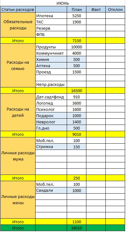 - Расписать все ваши расходы по важности, способ оплаты ( Н- наличка; Э -по карте) и по сроку наступления обязательного платежа на июнь (если знаете примерные суммы трат по обязательным платежам, то указываете, если нет, то не надо)