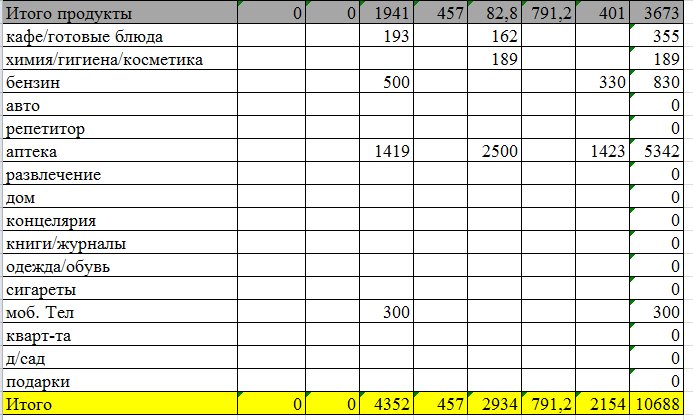 Итого на следующую неделю около 500 рублей (из-за перерасхода двух прошлых недель), а нам этого точно не хватит, так как надо ехать в другой город. Соответственно и на ПБ не остается. В общем, на следующей неделе надо серьезно проанализировать весь месяц.