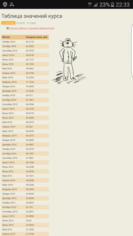 На тебе наши скачки за последние два года. Те кто купили в прошлом году с августа доллары близко сейчас в случае необходимости не сдадут их по той цене. А я на рублевом депозите за этот год 100000 заработала. А вот все что сверх этой суммы пошло я перевожу в доллары и евро. Так как на оперативную подушку безопасности больше мне не надо. На свадьбы/похороны (ни дай бог), операции срочные мне этих денег хватит. К слову операция которую я наконец созрела и сделала сегодня, что в 2013 стоила 35000, что сейчас столько же я отдала. (Ну это конечно не дорогостоящая, но с дорогими та же фигня)