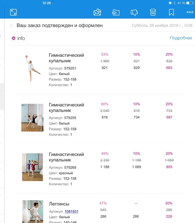Дочке нужен к понедельнику гимнастический купальник. Носиться по магазинам некогда. Заказала на WB несколько штук на завтра, будем мерять и выбирать лучший. Доставка бесплатная. Заодно также заказала себе чуть из Ив Роше со скидкой ок 60%. Скидка действует вроде бы все выходные. Окончательная цена - розовая.