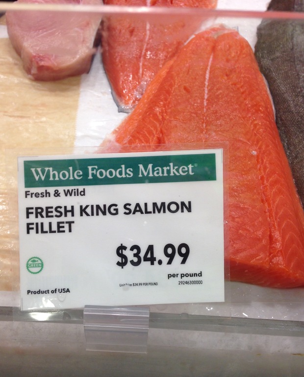 Это лосось. Дикий, то есть не выращенный. Цена за фунт. В пересчете за килограмм получается 77 usd или 4 620 р.