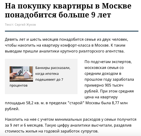При исходных данных (доходах) купить квартиру по указанной цене невозможно ни с ипотекой, ни без ипотеки. А суть выложенной статьи не в том, что надо копить, а не брать ипотеку, а в том, что есть определенная статистика, сколько лет нужно человеку, чтобы накопить на квартиру, откладывая весь свой запас. Это некий статистический индекс. Нормой соотношения доходов и стоимости жилья считается, если не ошибаюсь, если стоимость квартиры равно 5 годам дохода. И это не значит, что надо 5 лет копить и не есть, не пить, это вот такой параметр. В Москве несоответствие доходов и стоимости жилья. Это хотел донести автор статьи, а не то, что давайте все копить по 10 лет.
