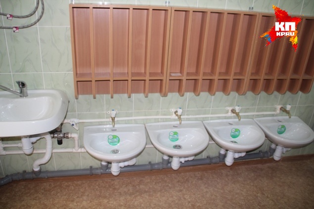 Одно из новшеств рядом с детскими раковинами расположена «взрослая». А новшество вот в чем. Вода в детские умывальники попадает из общего крана взрослой раковины, над которой установлен водонагреватель. Сделано это для того, чтобы малыши всегда могли умываться горячей водой в случае отключения горячего отопления.