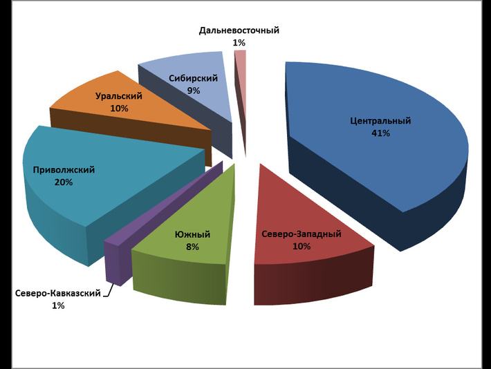 Структура производства комбикормов в России по федеральным округам (по годовым данным 2014 года:
