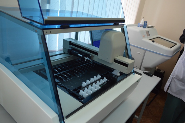 Медики рассказали гостям, что специфика диагностического корпуса заключается в том, что он связывает все единицы техники в единый «организм». В нем расположены отделение ультразвуковой диагностики, рентгенодиагностическое отделение, отделение внутрипросветной эндоскопической диагностики, а также отдел патоморфологических исследований центральной клинико-диагностической лаборатории.
