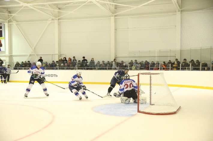 После символического вброса шайбы на арене состоялся матч между местными хоккейными командами «Строитель» и «Алга-Башнефть».